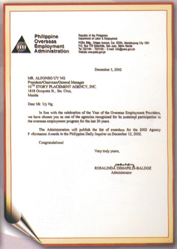 - Citation from the Philippines Overseas Employment Agency as "One of the top agencies recognized for its sustained participation in the employment program for the past 20 years."